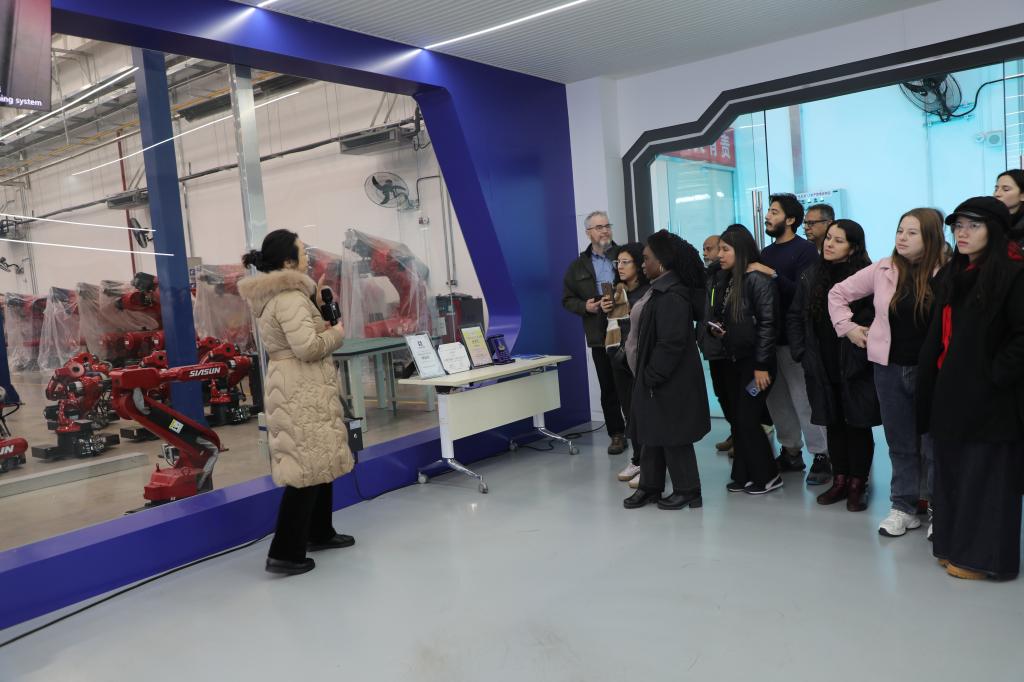 在天津空客总装有限公司,留学生们近距离观摩A350系列飞机的全流程作业。在新松机器人自动化股份有限公司,大家实地参观了工业机械臂在汽车制造、电子加工等方面的精准作业,深入了解了协同机器人、港口搬运AGV机器人的发展脉络与技术突破。在“天津之心”高空观景平台,大家近距离感知天津城市的发展脉搏。