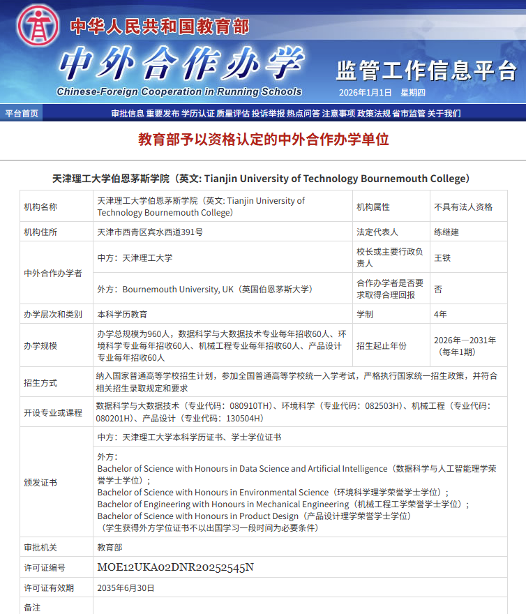 天津理工大学伯恩茅斯学院(英文: Tianjin University of Technology Bournemouth College)是我校非独立法人的中外合作办学机构,为我校实体二级学院,将于2026年开始招生。学院首批开设:数据科学与大数据技术(专业代码:080910TH)、环境科学(专业代码:082503H)、机械工程(专业代码:080201H)、产品设计(专业代码:130504H)四个专业的本科学历教育。专业全部纳入国家普通高等学校招生计划,执行国家统一招生政策。学院本科专业标准学制为四年,采用“4+0”培养模式,全部培养过程均在我校完成。教学团队由中英两校优秀师资共同组成,全面引入英国伯恩茅斯大学的课程体系、教学方法和学术资源。学生入学后同时注册中英两校学籍,达到毕业及学位授予条件者可获得两校相应学位,对提升学校办学国际化层次、拓宽学生全球视野具有里程碑意义。