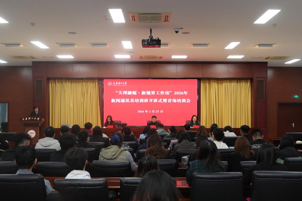 3月27日,学校举办“天理融媒·新视界工作坊”2026年新闻通讯员培训班开班式暨首场培训会。校党委副书记许瑞、人民网天津分公司编辑中心主任张静淇、党委宣传部负责同志出席活动。来自全校52个单位的61名新闻通讯员参加培训。