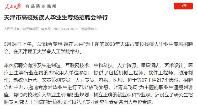 据应聘高校残疾人毕业生反映,会前通过天津市残联社会保障和就业服务中心微信公众号就了解到招聘会信息,各区残联也告知了招聘会信息。招聘会提供的岗位可满足听力、语言、肢体、低视力等不同类别不同专业高校残疾人毕业生就业需求。本次招聘会虽然规模不大,但小而精、优而专,可供选择的岗位很多,并且薪资和福利待遇很具竞争力,对自己来说是一个很好的求职机会。参加招聘会的用人单位表示,此次招聘会很大程度上解决了招聘高学历残疾人难的问题,前来求职残疾人都具有大专以上学历,收到的简历质量很高,非常感谢有这样一个平台。