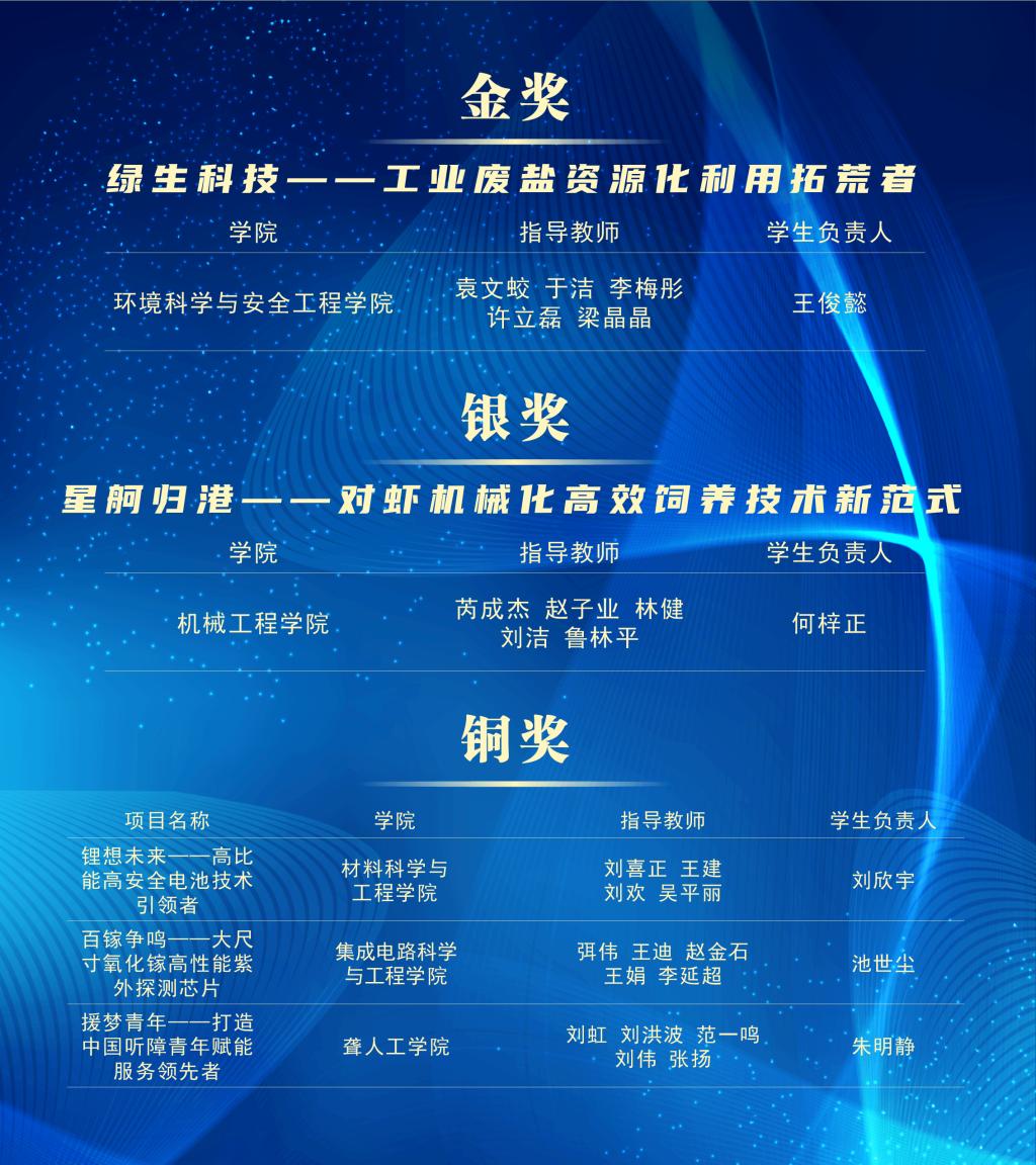经过校级初赛、省级复赛和全国决赛初评,我校两个项目入围全国决赛终审答辩环节。其中,环境科学与安全工程学院推报的“绿生科技——工业废盐资源化利用拓荒者”项目荣获全国金奖;机械工程学院推报的“星舸归港——对虾机械化高效饲养技术新范式”项目荣获全国银奖;材料科学与工程学院推报的“锂想未来——高比能高安全电池技术引领者”项目,集成电路科学与工程学院推报的“百镓争鸣——大尺寸氧化镓高性能紫外探测芯片”项目,聋人工学院推报的 “援梦青年——打造中国听障青年赋能服务领先者”项目均获全国铜奖。