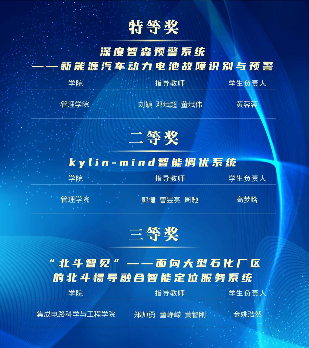 2024年度“揭榜挂帅”专项赛设置高校学生赛道和青年科技人才赛道,共吸引2.7万余人参加、6500余件作品参赛,最终来自全国410余所高校和企业的1950余件作品入围终审决赛。我校管理学院“深度智森预警系统——新能源汽车动力电池故障识别与预警”项目荣获全国特等奖;管理学院“kylin-mind智能调优系统”项目荣获全国二等奖;集成电路科学与工程学院“‘北斗智见’——面向大型石化厂区的北斗惯导融合智能定位服务系统”项目荣获全国三等奖。