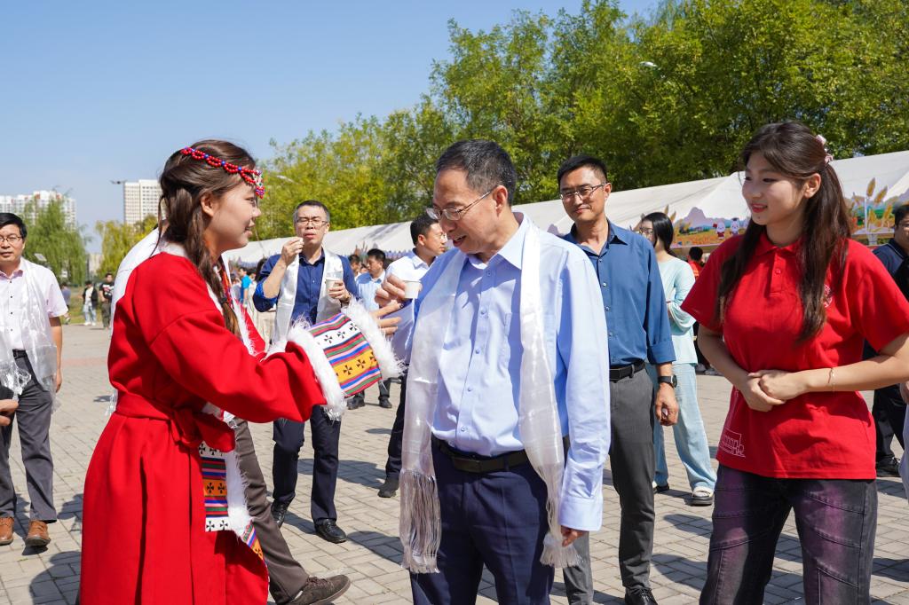 在活动现场,藏族同学为嘉宾献上象征祝福的哈达,展现出民族团结、亲如一家的浓厚氛围。同学们一致表示,要像石榴籽一样紧紧抱在一起,共同成长进步,努力成为堪当民族复兴大任的时代新人。
