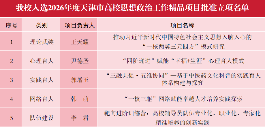 在2026年度天津市高校思想政治工作精品项目申报工作中,全市共收到立项申报226项,决定批准立项85项,我校在理论武装、心理育人、实践育人、网络育人、队伍建设类别中共有5个项目脱颖而出进入批准立项名单。