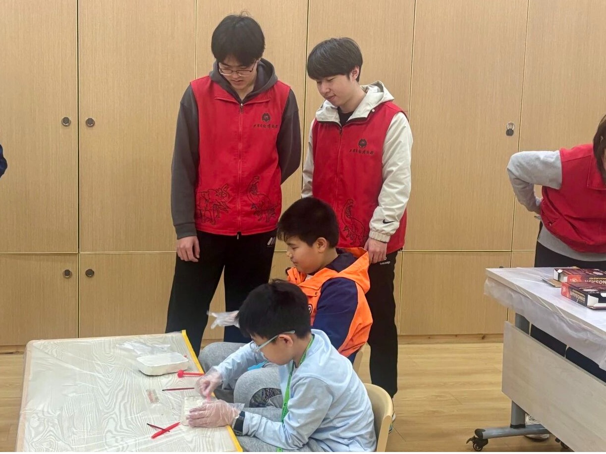 活动中,志愿者化身“科普小老师”,引导孩子们参与专业讲座,并协助他们完成以地球科学为主题的趣味闯关任务,现场气氛活跃、寓教于乐。随后,志愿者与孩子们一同观看科普影片,通过沉浸式视听体验,探寻恐龙时代的奥秘,感受自然演化与生命奇迹。